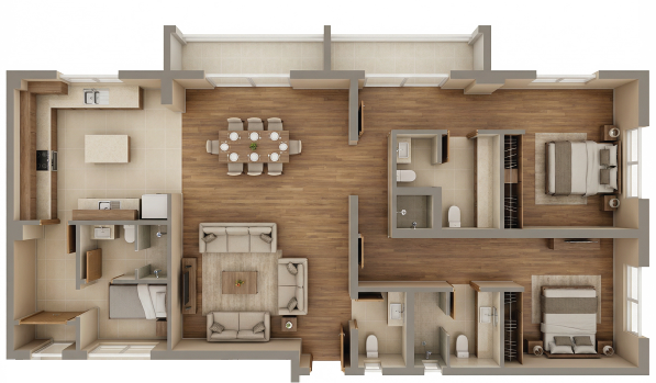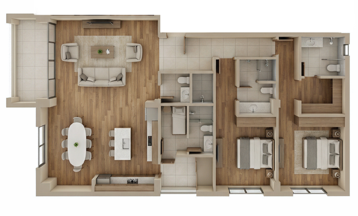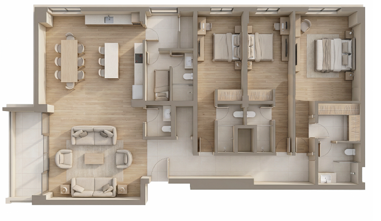 Designed for modern lifestyles, the 165m² two-bedroom residences combine smart layout planning with refined comfort.